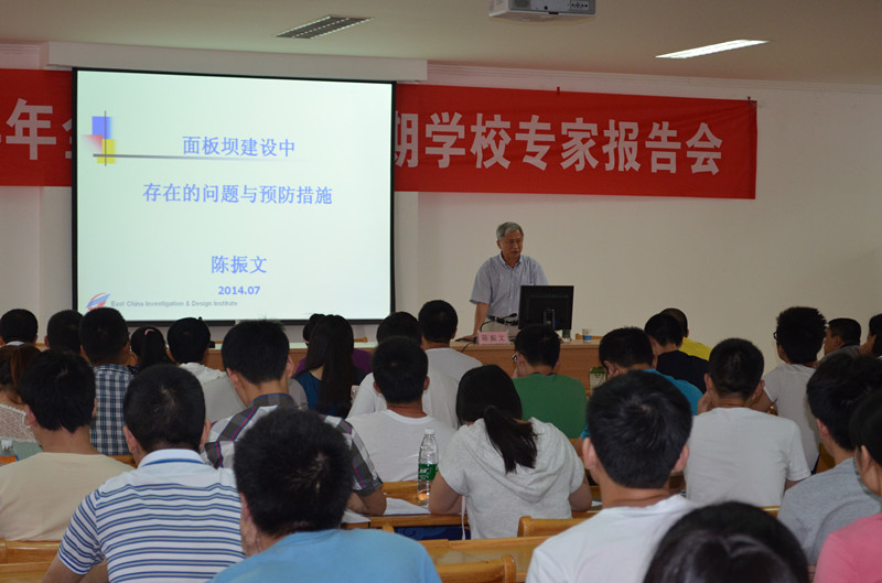 陈总首先结合天生桥一级、白云等电站面板坝存在的挤压破坏和渗漏的问题,为大家介绍了面板坝挤压破坏和渗漏的修复技术手段。进而对面板坝的破坏因素和机理作了简单分析,最后提出了预防面板坝破坏的技术措施。陈总工程经验丰富,报告会后众多学员争相提问,报告会在热烈讨论中结束。