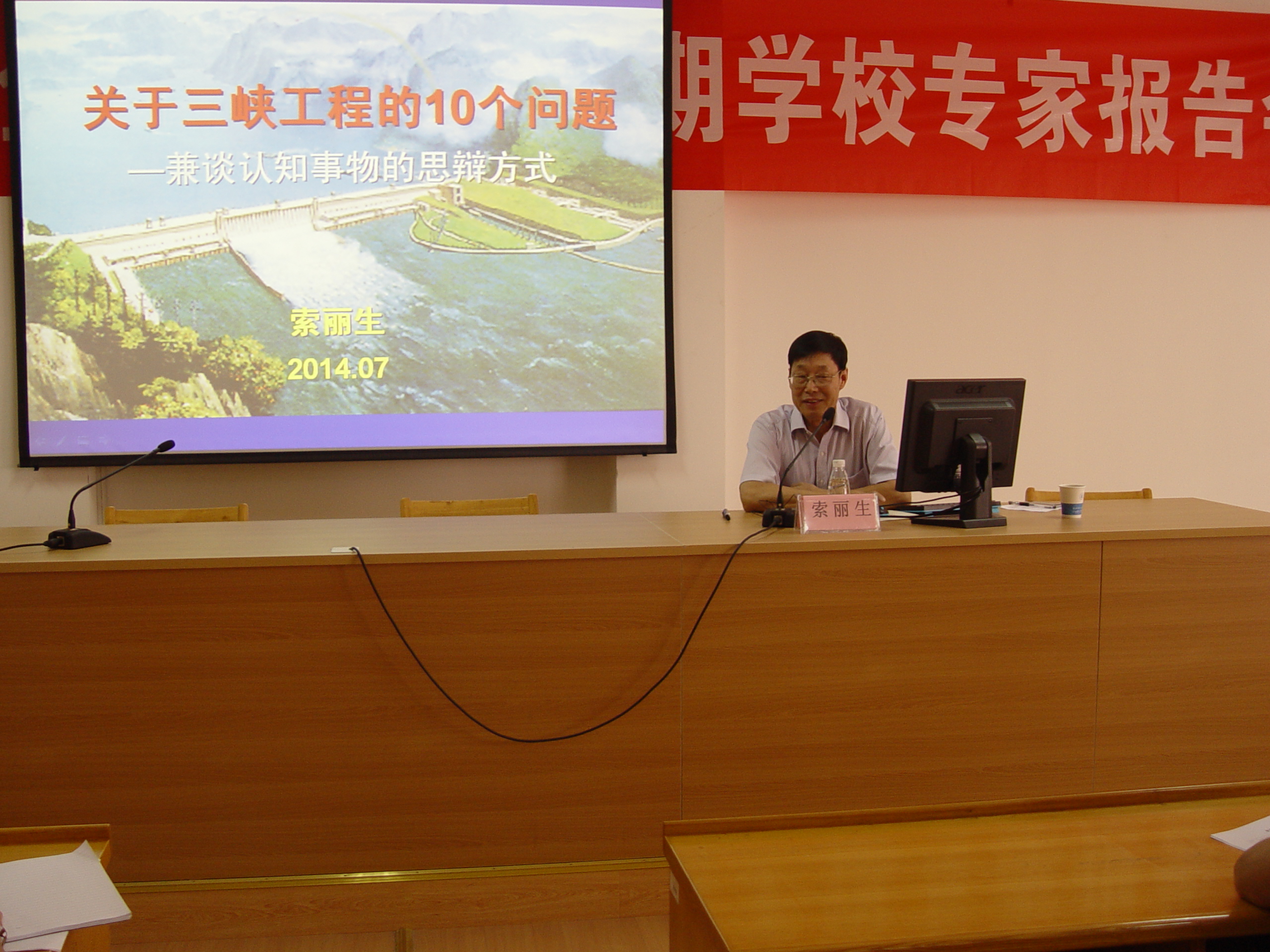 索教授首先介绍了三峡工程概况。接着他针对社会上和学术界存在的十大问题,用各方面的统计数据开展论证,提出其看法和结论。会上他指出,三峡工程主要的效益在于防洪,其供水能力有限;三峡的移民问题还有待观察,移民的生活质量有待进一步提高;三峡水库污染应当从上游污染源控制方面着手;长江珍惜物种已经通过人工方法弥补;对文物景观存在影响但是不大;三峡不是造成当地区气候变化的主要原因;三峡安全,有预防受到战时攻击的放水策略等观点。接着索教授根据其参与三峡工程建设的过程,向学员们分享了其得到的要敢于质疑、勤于思考、坚守职业道德、尊重不同意见的启示,他进一步教育各位学员应当立足数据,笃信科学,摒弃主观成见,要透过表象看本质,索教授最后指出,项目的建立要秉持开拓创新、综合评价、权衡利弊关系,统筹兼顾做决策。索教授对三峡工程的阶段性结论是:三峡工程利弊明朗,功能显现,基本符合预期;三峡工程建设顺利,技术先进,质量好,管理优,获得FIDIC认可;而移民问题有待进一步观察。索教授对学员们十分谦和,谆谆教导,各位学员受益良多。