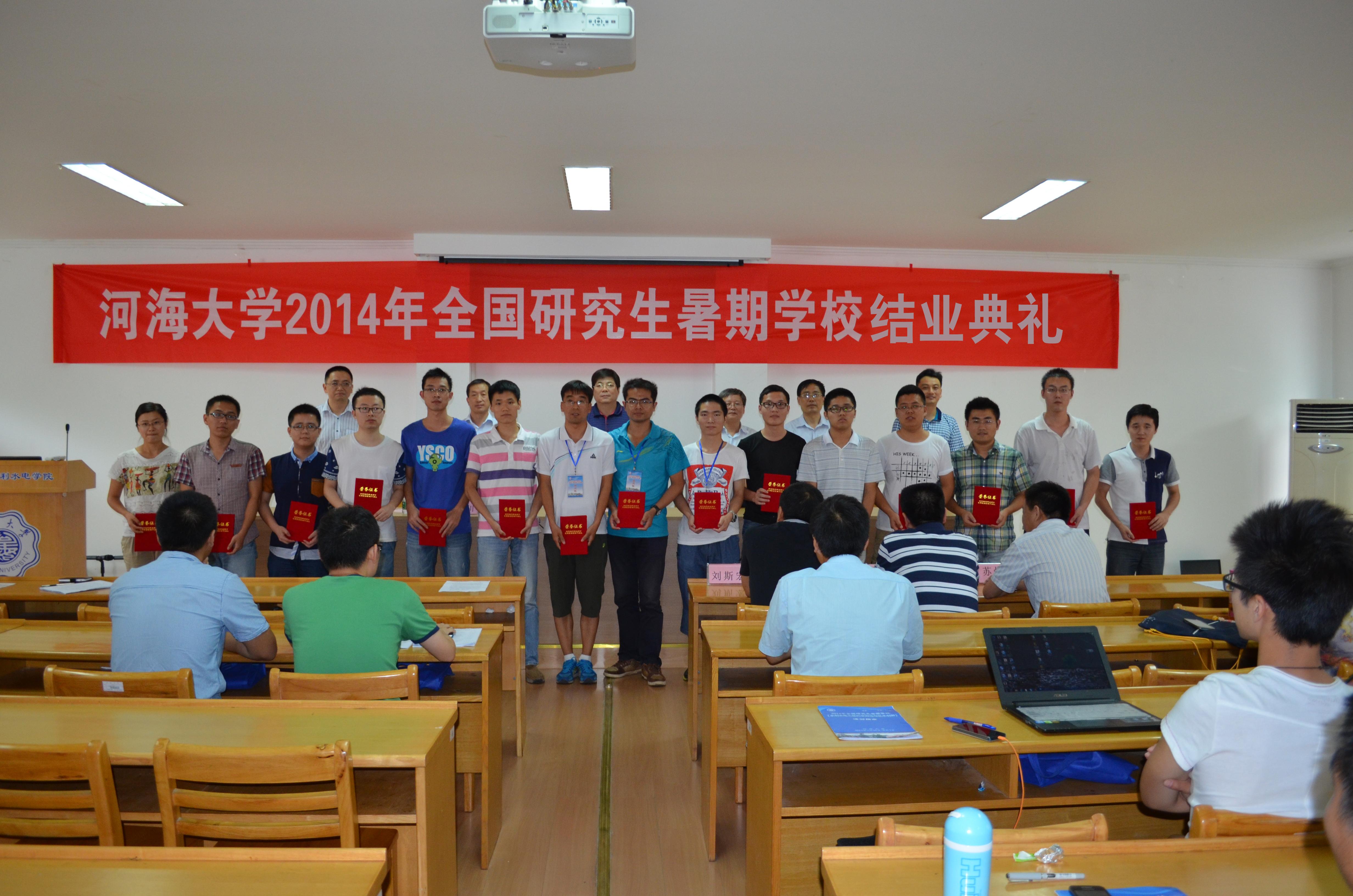 8月2日下午,河海大学2014年全国研究生暑期学校(水利水电工程科学前沿与技术创新)结业典礼在水电馆401顺利举行。河海大学副校长朱跃龙教授、研究生院常委副院长董增川教授、性爱直播 院长顾冲时教授、性爱直播 党委书记张展羽教授、副院长沈振中教授、水工结构研究所所长刘斯宏教授、水利水电研究所所长张健教授、水工结构研究所副所长苏怀智教授、水利水电研究所副所长周建旭教授出席了结业典礼,典礼由性爱直播 副院长肖洋教授主持。