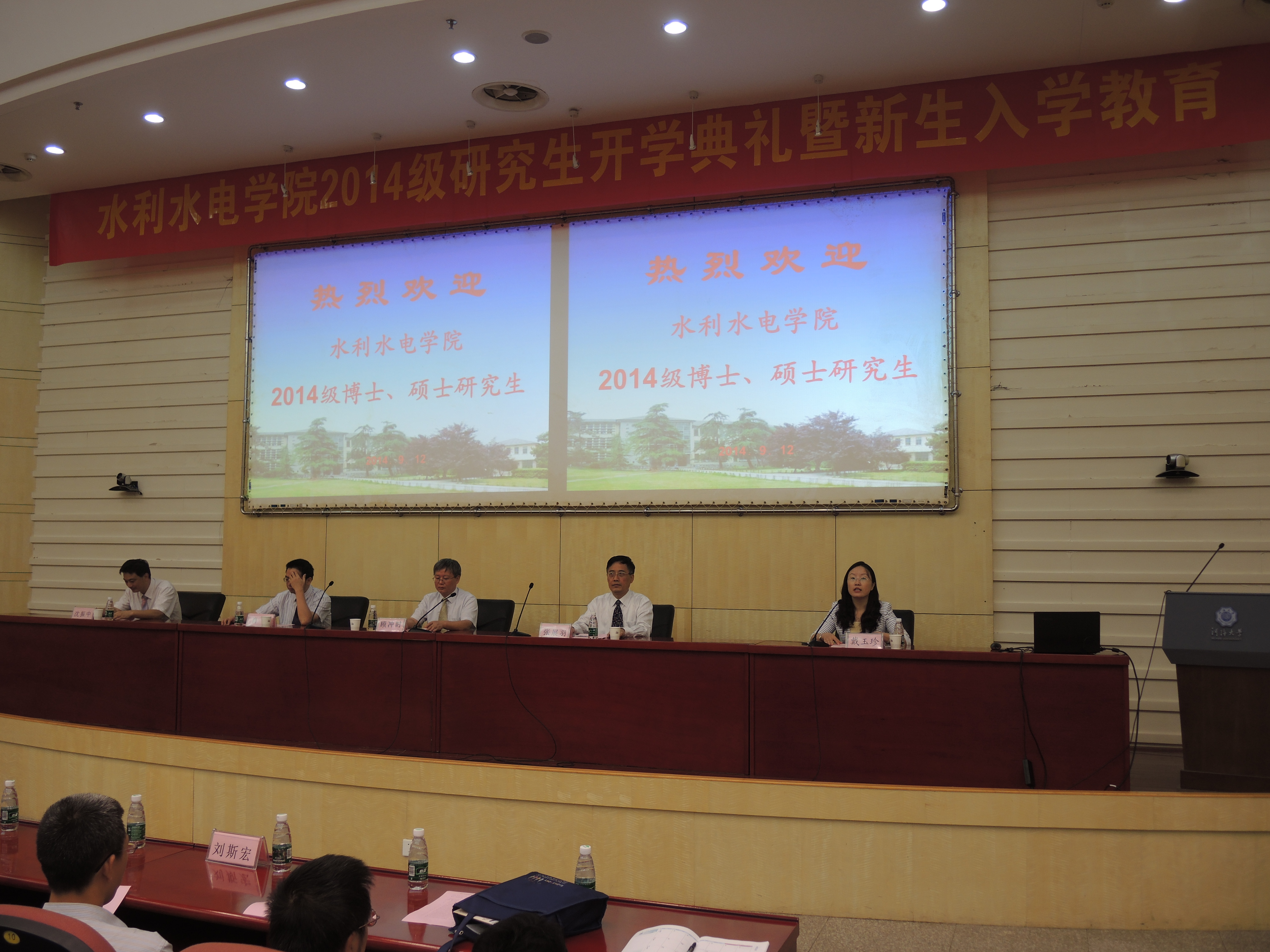 2014年9月12日上午8:30,性爱直播 在闻天馆108隆重举行2014级博士、硕士研究生开学典礼暨新生入学教育。性爱直播 院长顾冲时教授,党委书记张展羽教授,副院长肖洋教授、沈振中教授,及水利水电工程系主任蔡付林教授,农业水利工程系主任朱成立副教授,水工结构研究所副所长苏怀智教授,水电研究所副所长周建旭教授,水力学及河流动力学研究所副所长杨校礼老师,农业水土工程研究所所长郭相平教授,农业环境研究所所长邵孝侯教授等出席了典礼,典礼由性爱直播 党委副书记戴玉珍老师主持。参加典礼的还有性爱直播 研究生教学秘书周昶老师、研究生辅导员赵志涵老师以及辅导员助管慕子煜老师。