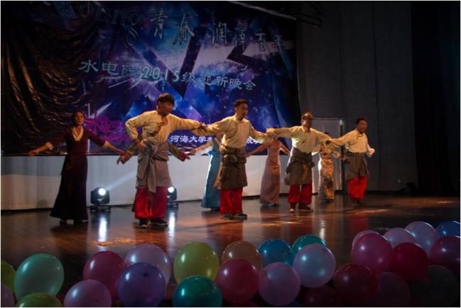 晚会在民族风味十足的《锅庄舞》中开场,迎新晚会正式拉开帷幕。学院老师的手风琴伴奏合唱旋律优美,余音绕梁;歌曲串烧、自弹自唱《青春》让晚上现场处处洋溢着青春的气息;学院14级全体国防生合唱《当那一天真的来临》帅气爆棚,让新生见识到不一样的威武霸气;校十佳歌手艾子墨的独唱《突然想起你》则让大家领略了校园明星的风采。诗朗诵《如果在河海拥有跨院百年的爱情》、相声《歪批三国》、模特秀、14级班长舞等精彩纷呈的节目将现场气氛一次次推向高潮。