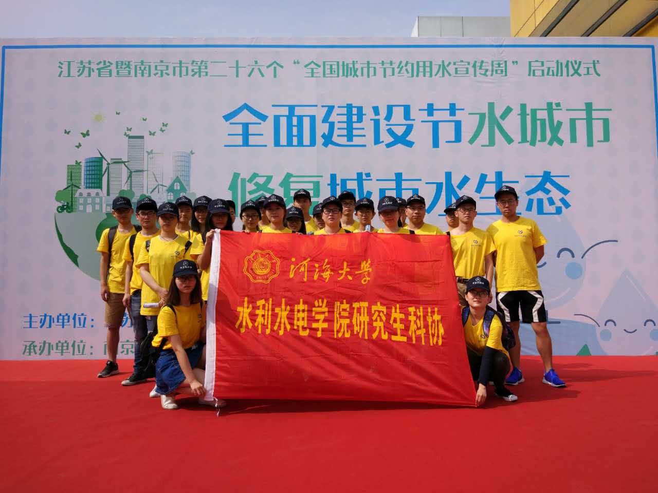 今年5月14日—20日是我国第26个“全国城市节约用水宣传周”,今年的主题为“全面建设节水城市、修复城市水生态”。5月14日上午,江苏省暨南京市节水宣传周启动仪式在新奇特拉开帷幕。仪式由市水务局章自强副局长主持,省住建厅陈浩东副厅长、城建处何伶俊副处长、市水务局章自强副局长、束文杰副局长等领导和全市10所高校的志愿者代表参加了启动仪式,水电院研究生科协数十名同学代表河海大学积极参与了本次活动。