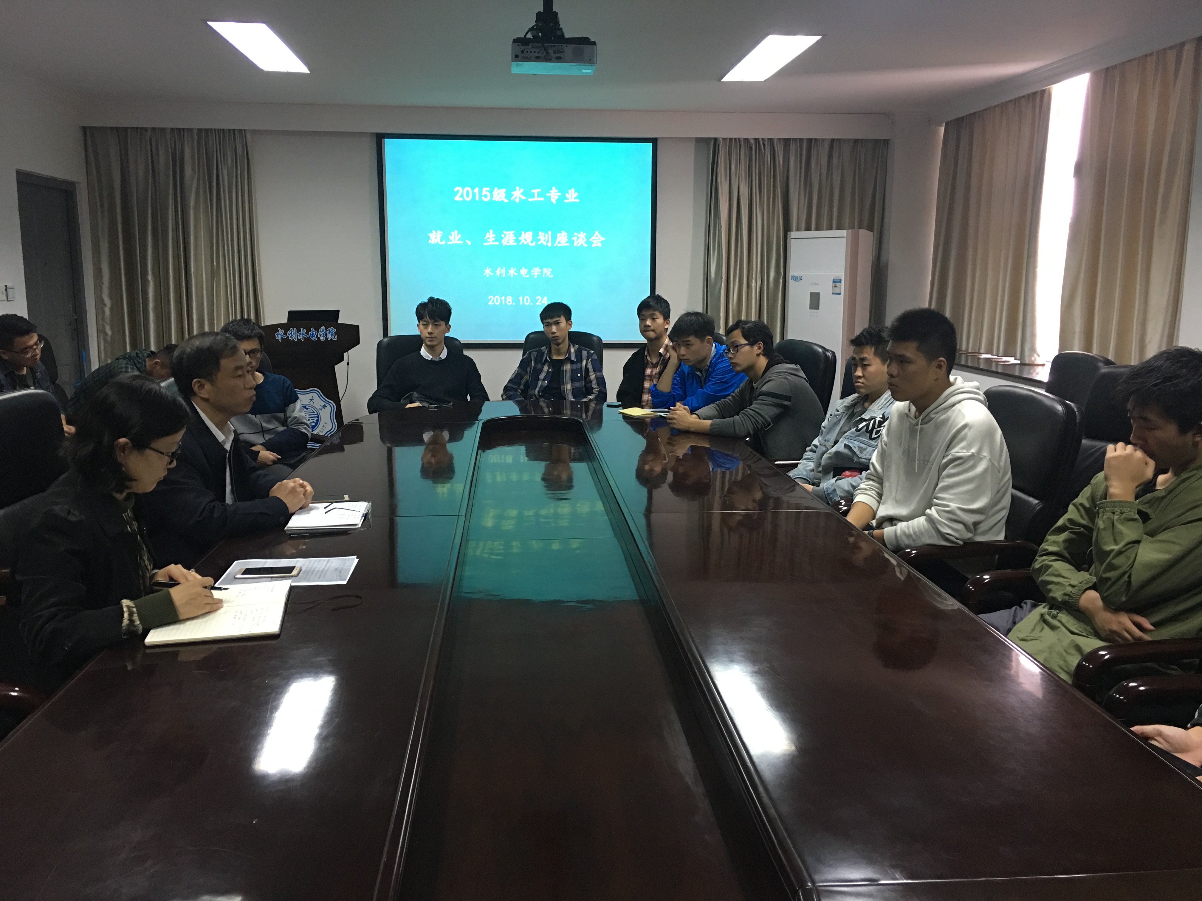10月24日,性爱直播 举行2015级水工专业就业、生涯规划座谈会。会议邀请院党委戴玉珍副书记、水利水电工程系主任蔡付林教授参加,2015级辅导员笪步源和水工专业学生代表共同参与座谈。