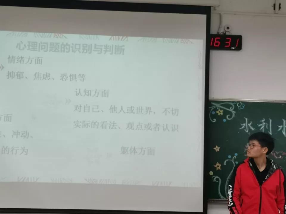 活动开始,由年级心理委员刘源为大家简要介绍大学生常见的心理问题及心理委员的作用。刘源指出:“同学们对心理委员存在误解,心理委员是大家的倾诉对象而不是辅导员的告密者。在心理问题出现前常伴随着一些‘高危信号’包括:情绪的重大变化和行为反常。”随后由各班心理委员为同学们从“什么是危机”“遭遇危机的表现”“危机的预防和排查”“危机处理”四个方面详细讲述如何应对突发心理问题。同学们认真听讲,积极参与讨论,学习工作顺利进行。经过抽样调查发现大家掌握良好,此类分组学习的方法可以推广。