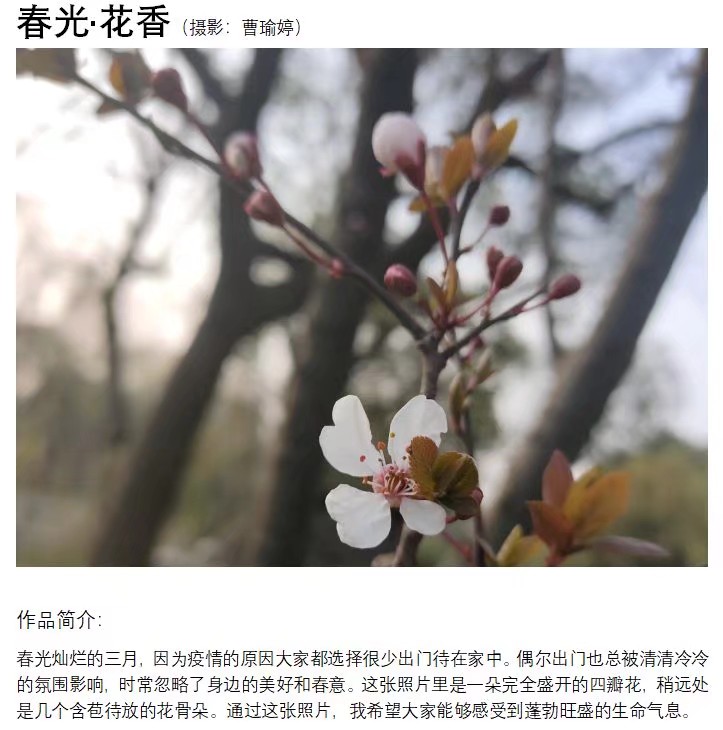 随着新型冠状肺炎疫情的来势汹汹,我们也许会在突如其来的冗长假日中迷茫了前行的方向,也许会在过于匆匆的网络世界里迷失了曾经的心意。为了帮助同学们关注自己的生活,发现身边的精彩,2019级的同学们趁着时光正好,趁着微风不燥,趁着冬日的寒风刚刚过去,春日的柔软悄然降临,用镜头当做妙笔,把时光流转,把光影交错都定格在交卷里,让灵魂在快门按动的咔擦声中,与草木相熟,与岁月相安,特此举办了居家摄影展活动。