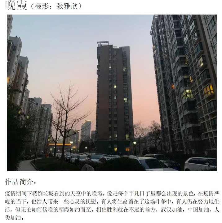 其实,山川异域,风月同天,无论是怎样的景致,我们都曾经在时光中轻轻走过,它们都曾经是我们生命中的一景。而想必也正是这样的风景,才使得我们在新型冠状肺炎疫情肆虐的这个冬天,即使在家中忍受着不能够出行的孤寂,也依然坚定地相信着,坚定地希望着:未来,在我们日日夜夜的等待中,在抗疫人员的辛苦奋斗下,新型冠状肺炎疫情疫情的严峻形势一定会彻底结束。此次摄影活动,是一次我们心灵的洗礼,更是我们内心深处对于疫情终将过去的坚定期待。