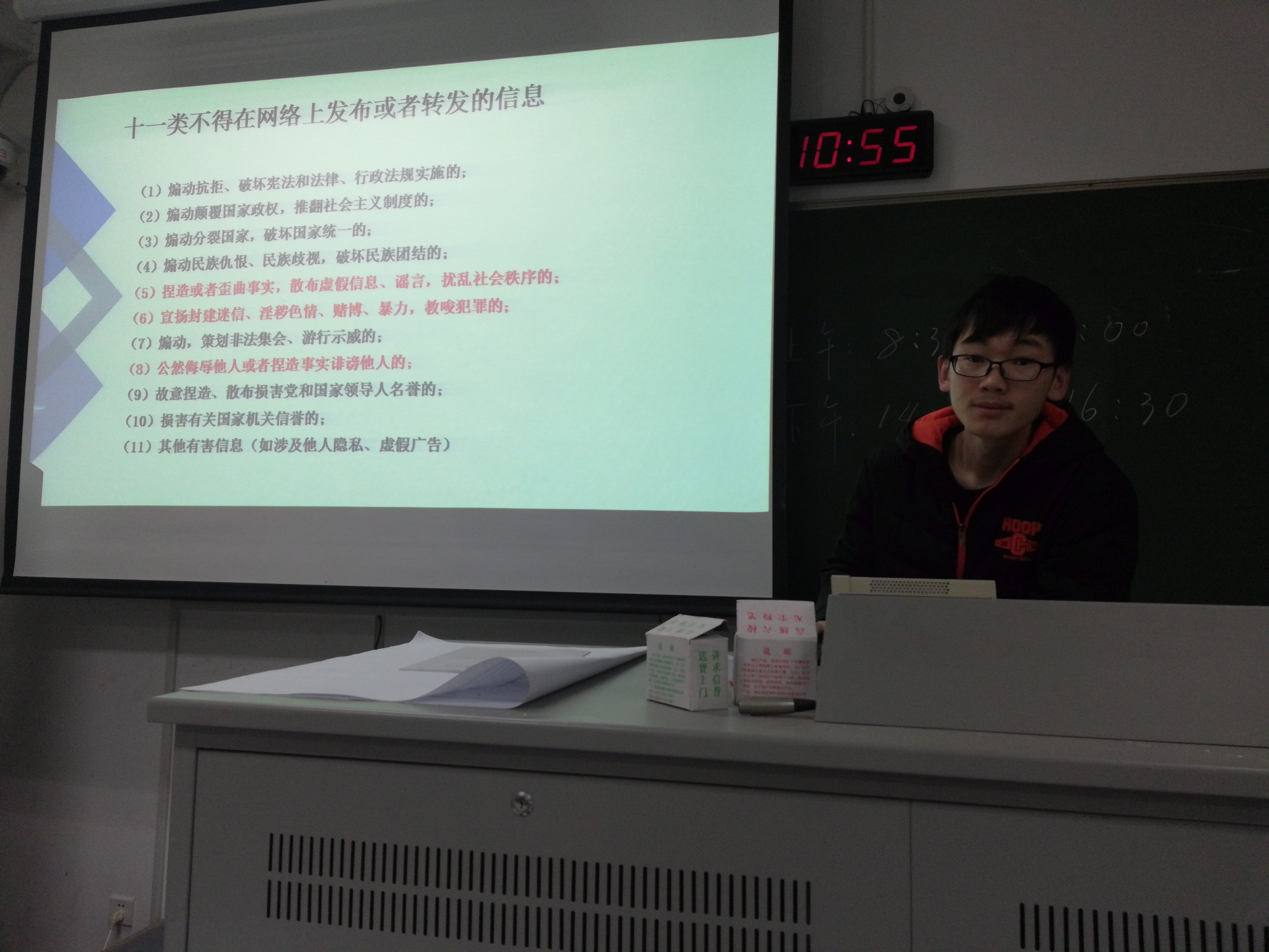 班会在六点半准时进行,班长韩建军同学就日益复杂的网络犯罪,例举了四个典型方面问题与同学们交流,包括:网络诈骗日益泛滥、网络淫秽色情、网络赌博屡打不绝、销售违禁品的网络黑市问题和网络黑客犯罪突出。其中着重强调了与我们息息相关的诈骗问题,具体包括利用“分类信息门户网站”发布虚假信息进行诈骗、冒充QQ诈骗和机票诈骗等。