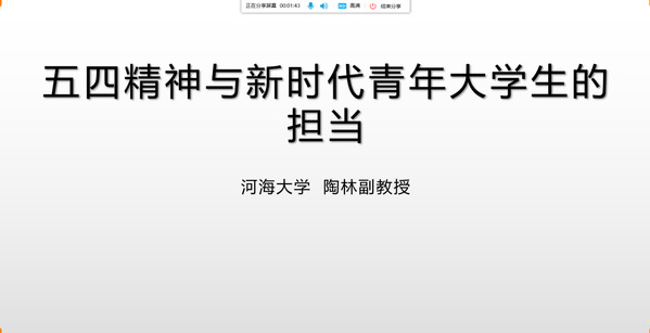 此次活动邀请到公共管理学院陶林副教授担任主讲人。陶教授以《五四精神与新时代青年大学生的担当》为主题,就“五四运动与五四精神的科学内涵”、“当代大学生为什么需要五四精神”、“当代大学生价值观的现状”、“新时代大学生的担当”四个方面通过具体实例进行了讲解,加深了同学们对五四精神的理解。同时,陶教授对新时代中国青年提出了几点希望并愿与之共勉:一是要树立远大理想;二是要树立对马克思主义的信仰、对中国特色社会主义的信念、对中华民族伟大复兴中国梦的信心;三是要热爱伟大祖国;四是要练就过硬本领,交好友读好书做好人;五是要担当时代责任。