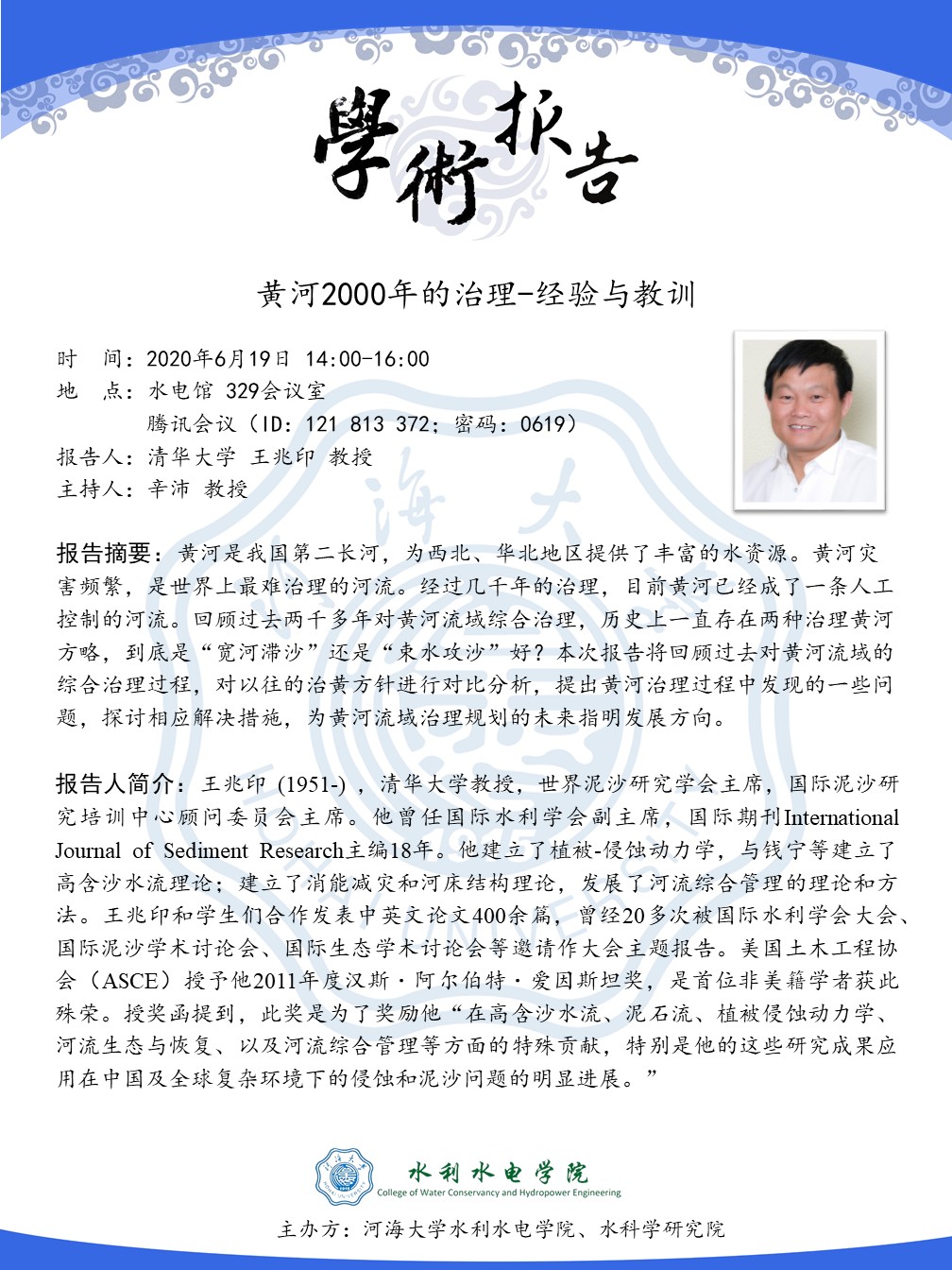 黄河是我国第二长河,为西北、华北地区提供了丰富的水资源。黄河灾害频繁,是世界上最难治理的河流。经过几千年的治理,目前黄河已经成了一条人工控制的河流。回顾过去两千多年对黄河流域综合治理,历史上一直存在两种治理黄河方略,到底是“宽河滞沙”还是“束水攻沙”好?本次报告将回顾过去对黄河流域的综合治理过程,对以往的治黄方针进行对比分析,提出黄河治理过程中发现的一些问题,探讨相应解决措施,为黄河流域治理规划的未来指明发展方向。