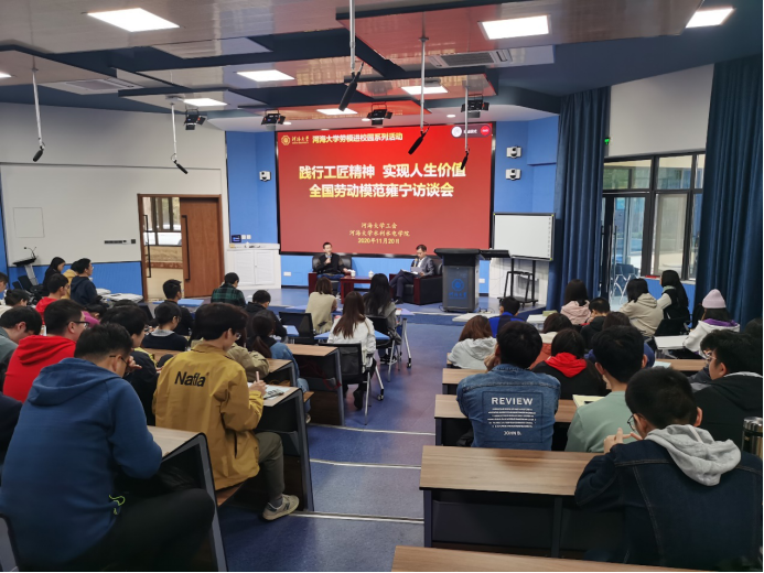 11月20日,性爱直播 召开“践行工匠精神,实现人生价值”劳模访谈会,邀请全国劳动模范、河海大学思想政治教育特聘导师雍宁开展专题访谈。校工会主席浦玲出席访谈会,性爱直播 党委副书记王方主持访谈,百余名研究生、本科生代表聆听了访谈会