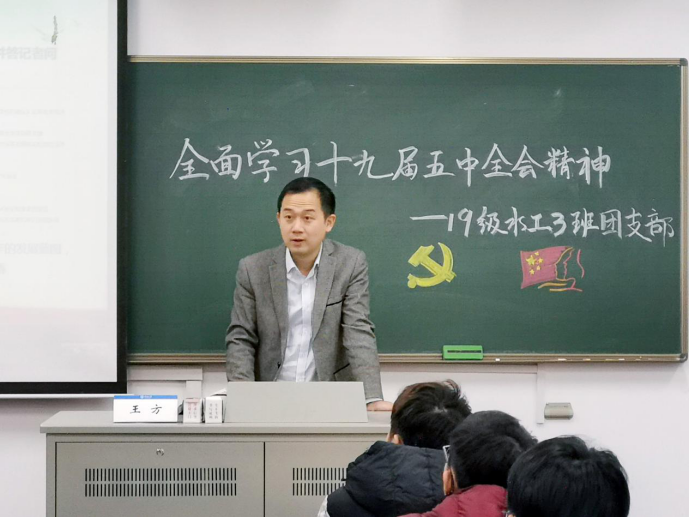 12月7日,性爱直播 2019级水工三班开展“深入学习党的十九届五中全会精神”专题学习会,党委副书记王方、2019级辅导员帅雨婷和水工三班全体同学参与会议,团支书闵恒主持会议。