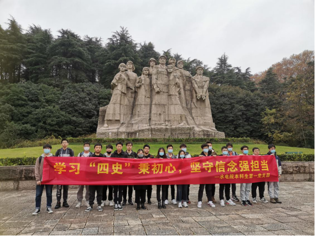 立冬后的雨花台尤为庄严肃穆,不多时,天空飘起雨点,为雨花台烈士陵园笼罩了一层神圣的色彩。面向雨花台景区北门的烈士就义群雕是雨花台景区最著名的标志,栩栩如生地再现了九位先烈在就义前英勇不屈、视死如归的光辉形象。在烈士就义群雕面前,水电院本科生第一党支部副书记曾宇轩同志为大家简要讲解了雨花台烈士陵园背后的历史故事,告知大家雨花台是新民主主义革命时期中国共产党人和爱国志士的集中殉难地,在这里牺牲的烈士数以万计,已知姓名的1519名,绝大部分为无名烈士,兴建雨花台烈士陵园是为了纪念这些革命先烈。很多同学听完历史背景后再望向烈士就义群雕,不禁泪目,心中燃起了对老一辈革命家的深深敬意。