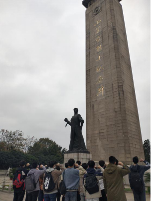 离开烈士就义群雕,全体同学来到了雨花台烈士纪念碑。雨花台烈士纪念碑高42.3米,寓意1949年4月23日南京解放,碑前立有一尊5米多高以“宁死不屈”为主题的革命志士青铜塑像。面对雨花台烈士纪念碑,各位同学重温入党誓词,更加坚定了为共产主义事业奋斗终身、随时准备为党和人民牺牲一切的的信念。