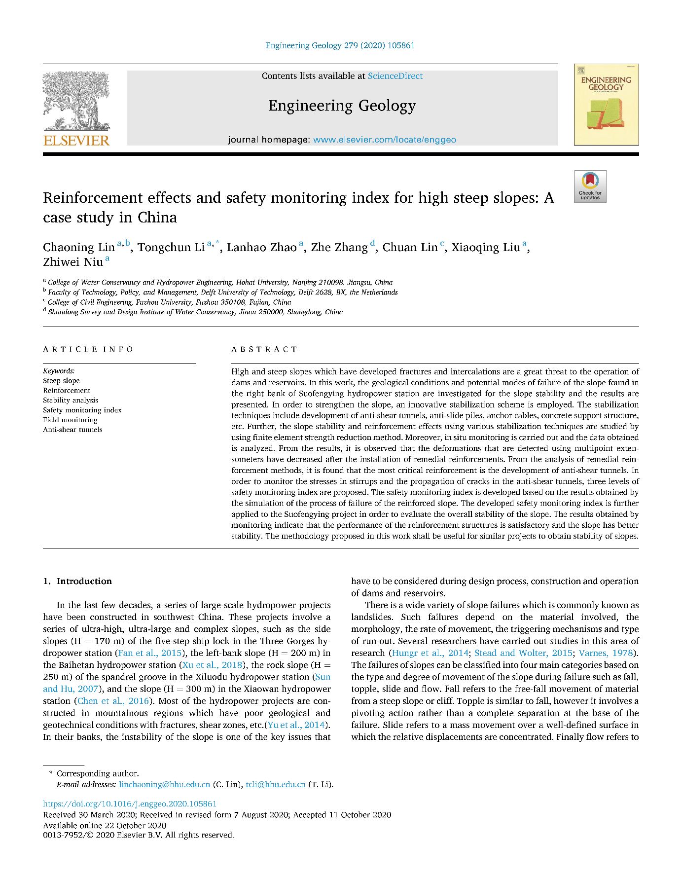近日,性爱直播 李同春教授研究团队在岩土工程类权威期刊《Engineering Geology》(河海大学A类期刊,中信所1区,影响因子4.779)上发表题为:“Reinforcement effects and safety monitoring index for high steep slopes: A case study in China”的研究论文。