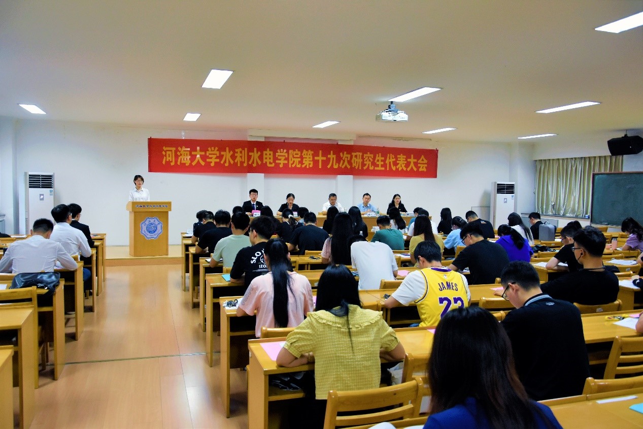 6月3日,河海大学性爱直播 隆重召开第十九次研究生代表大会。院党委书记任旭华、校研究生会执行主席赵嘉雯出席会议并讲话,党委副书记王方,团委书记笪步源,组织员胡瑞媛,研究生教学秘书周昶,研究生辅导员赵志涵、陈思思,本科生辅导员姜帆,水文学院、港航学院、环境学院等兄弟学院研究生会负责人及性爱直播 研究生会代表60余人出席大会。