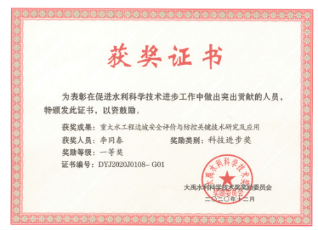 相关成果获得2020年大禹水利科学技术奖一等奖。参编国家标准与行业规范3项,入选水利部先进技术推广名录1项。取得授权国家发明专利6项,软件著作权12项。出版学术专著6部,发表高质量论文148篇。