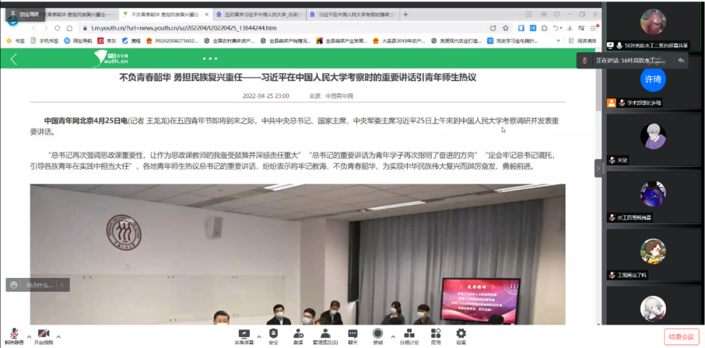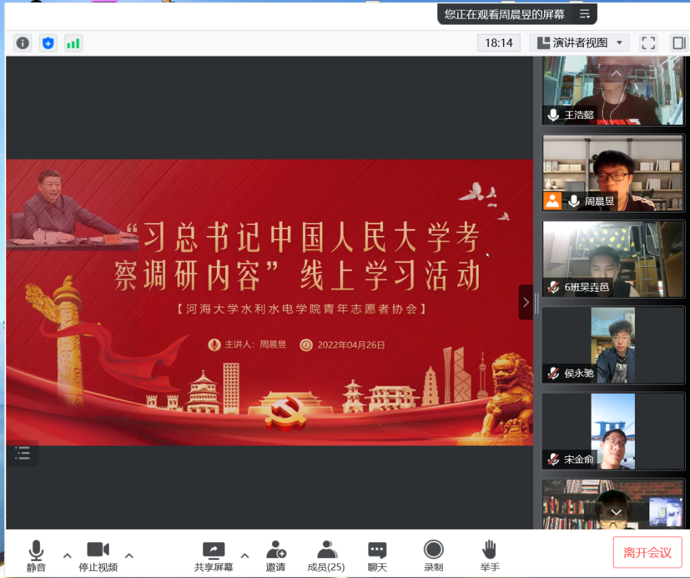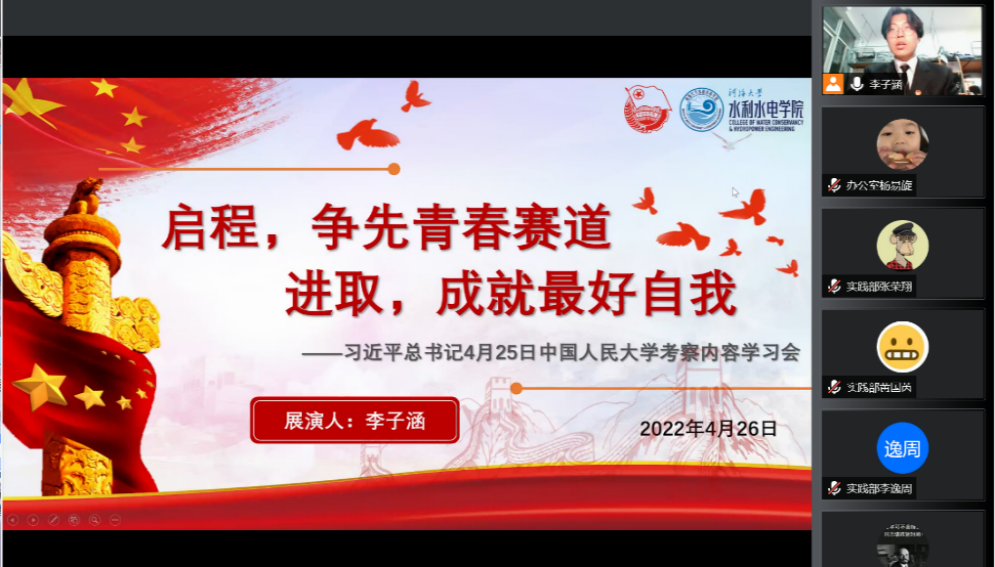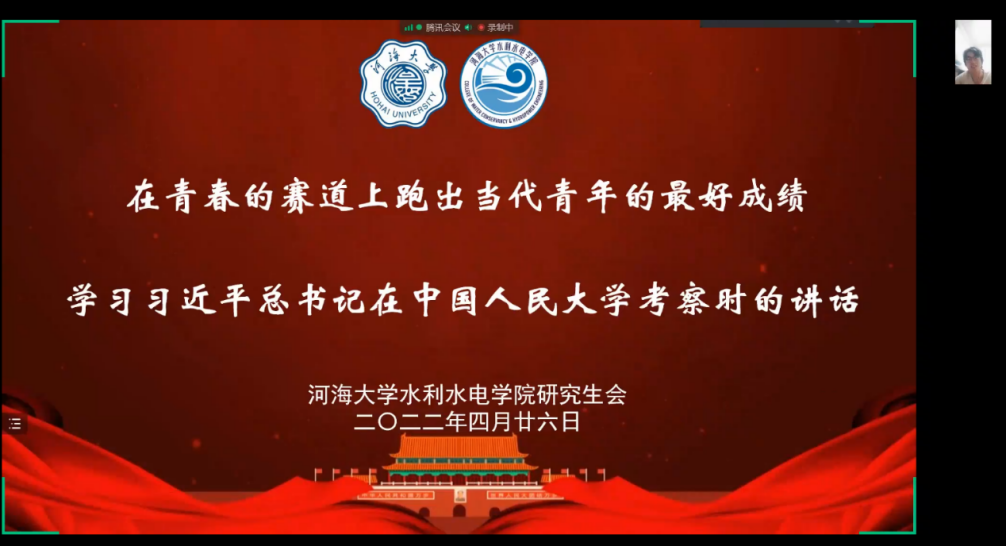 院研究生会于4月26日晚以腾讯会议的形式举行了专题学习交流会。通过播放习近平总书记在中国人民大学考察时的新闻视频,结合河海大学水利工程的一流学科特色进行了进一步的分享和交流。从新民主主义革命时期的张闻天精神,到新中国建立后的兴修水利,一代又一代的河海青年都在自己的岗位上发光发热。
