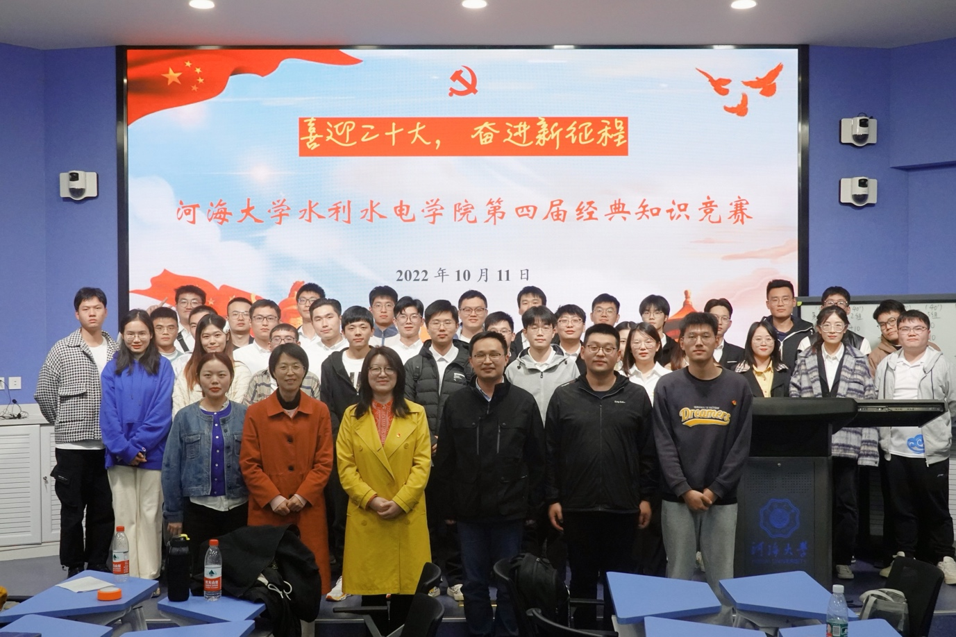 10月11日,性爱直播 第四届经典知识竞赛决赛在科学会堂102开赛。以“喜迎二十大,奋进新征程”为主题,此次竞赛由院党委主办,水力学及河流研究所教师党支部和博士生党支部联合承办,院研会协办。河海大学党委组织部季超、水力学及河流研究所副所长闫静、院党委组织员胡瑞媛、研究生辅导员陈辰等老师出席并担任评委,竞赛由“全国百个研究生样板党支部”水力学及河流动力学博士生党支部书记夏定康主持。