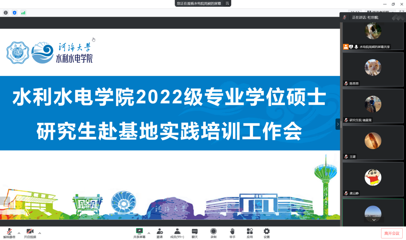 16日,性爱直播 召开2022级专业学位硕士研究生赴基地实践培训工作会。学校党委研究生工作部副部长、研究生基地管理办公室主任杜世舰,研究生基地管理办公室储晨雪,水电院副院长王建、党委副书记戴媛媛、教学秘书周昶、研究生辅导员陈思思及2022级全体专业硕士研究生在线上参加此次培训工作会。会议由王建副院长主持。