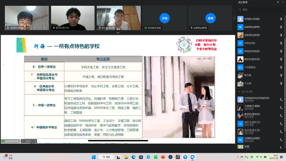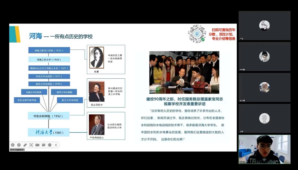 在包头市第九中学,实践团于钉钉线上网络直播平台顺利召开宣讲会。会议得到了母校的学生及家长的广泛关注,很多学生、家长在直播间聆听河海故事,了解河海文化。同时,在宣讲过程中,不少家长和同学针对自身目前情况向实践团队成员提出自己的疑虑,实践团成员都一一作出解答,并针对“专业选择”、“职业规划”、“发展方向”、“就业前景”等多个关注度较高的问题进行了更为详细的解答。宣讲活动得到了学生家长和校方的双重肯定,河海大学的水之子们真正将宣传教育落到实处。